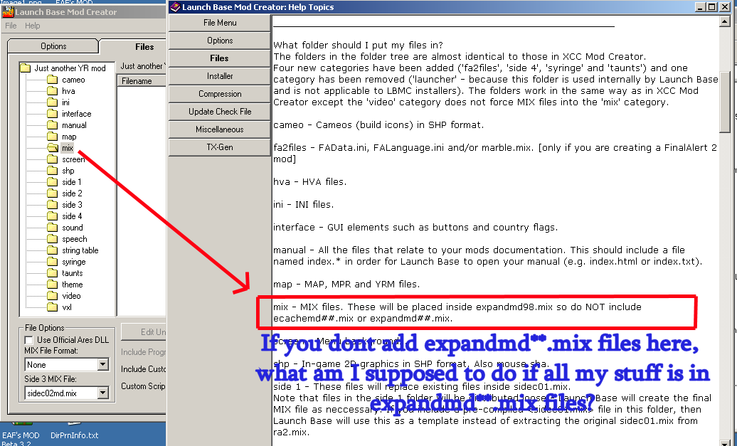 I tried to find some info pertaining to my question, but couldnt find any. Sorry if its here somewhere and i missed it. But I'm trying to put my mod together with LaunchBase ModCreator, I have all my stuff in expandmd**.mix files, but it says in the help section that ecachemd and expandmd mix files should not be put into the Mix file folder. If this is the case, where do i put them? Please dont tell me I have to pull all 1287 files out and make them loose.