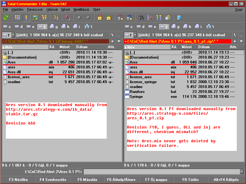 The LaunchBase update screen shows that the stable is version 710 (Ares 0.1 P1, isn't it?), although I think the checksums the validation uses are still the 666 versions' one. I think this, because ares.mix passes the verifying, and in the SVN, it's revision is 544, while both the dll and inj has revision number 710.